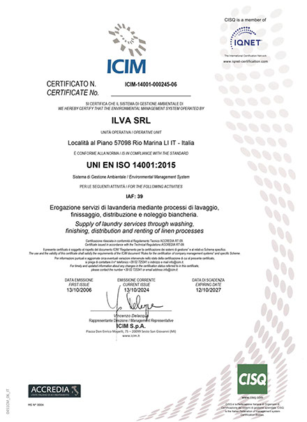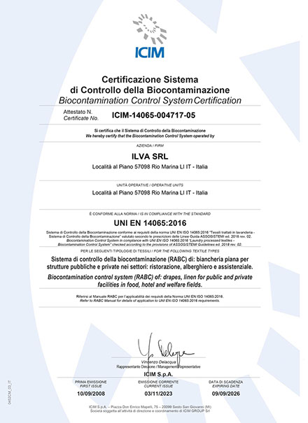 La Lavanderia Ilva di Rio Marina, dopo aver conseguito la certificazione UNI EN ISO 9001, ha aderito e quindi certificato il suo operato in conformità alle norme internazionali UNI EN ISO 14001 (certificazione ambientale) e dal 2008 anche alla UNI 14065 che conferma e valorizza il soddisfacimento dei requisiti di controllo della contaminazione microbiologica del tessile venduto.
