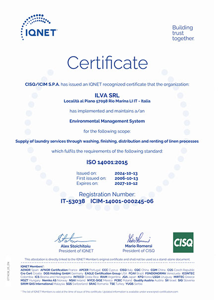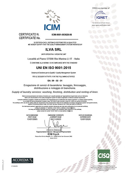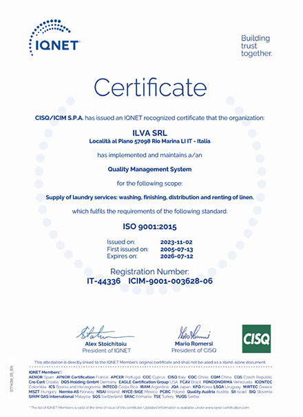 La Lavanderia Ilva ha ritenuto fondamentale adeguarsi alla normativa internazionale ISO. Una esigenza cha ha portato un contributo rilevante all’organizzazione dell’intero Sistema Azienda, migliorandone il controllo e l’efficienza in tutti i settori. Ha inoltre permesso di andare incontro alla richiesta, da parte dei clienti, di avere sempre più fornitori con prodotti certificati.